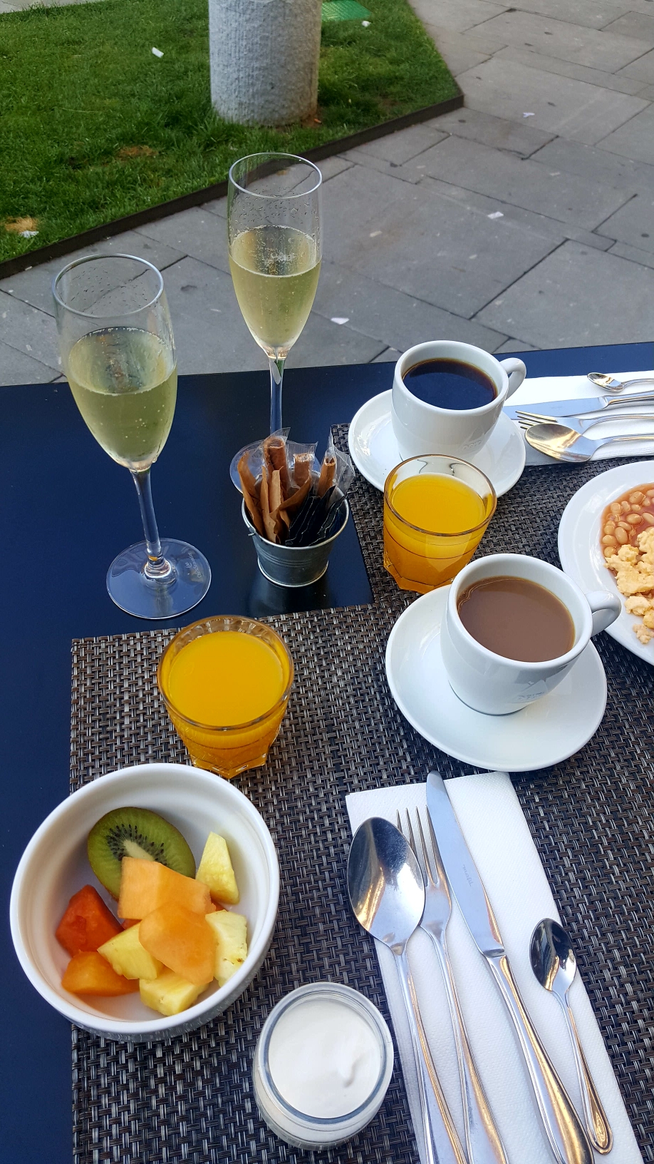 Nachts war es noch ganz schön laut draußen, trotzdem habe ich sehr gut geschlafen. Beim ersten Blick morgens aus dem Fenster torkelten immer noch einige englische Fans an unseren Haus vorbei. Wir gingen frühstücken. Nebenan gab es ein gutes Hotel. Dort wurde ein Frühstücksbuffet angeboten. Gönnen!!!😀